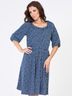 Платье отрезное по линии талии. Рукав реглан,3/4, по низу на эластичной тесьме. Горловина переда и спинки собрана в сборку. Юбка полусолнце. По шву талии эластичная тесьма. Платье без подклада.