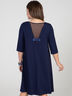 Платье А-образного силуэта, выполнено из мягкого трикотажного полотна средней плотности темно-синего цвета, рукав 3/4, круглая горловина. По спинке V-образная вставка из трикотажной мягкой сетки. Декоративный бант из атласной ленты. Без застежки, без подклада.