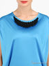 Детали: округлый вырез горловины, короткий рукав, оригинальный крой, контрастные вставки, вырез горловины расшит бусинами