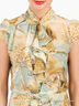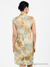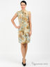 Детали: небольшой ворот-стойка, короткий рукав, складки, полочка декорирована жабо, юбка с подкладом