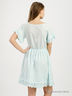 Романтичное платье с красивыми деталями из шитья. Короткие рукава, круглый вырез с 3 пуговицами. Складки спереди. Горизонтальные складки по низу. Воланы из шитья по краям рукавов и низу. Завязывающийся пояс.