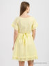 Романтичное платье с красивыми деталями из шитья. Короткие рукава, круглый вырез с 3 пуговицами. Складки спереди. Горизонтальные складки по низу. Воланы из шитья по краям рукавов и низу. Завязывающийся пояс.
