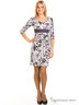 Платье приталенного покроя с рукавами 3/4 и округлым вырезом горловины. Изделие выполнено из принтованной ткани и декорировано вставкой из ткани контрастного цвета спереди. Отличный вариант на каждый день.