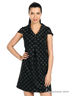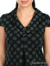 Платье женское из мягкого трикотажа средней плотности. Силуэт трапециевидный, позволяет скрыть недостатки фигуры. Вырез горловины дополнен элегантным воротником с пришитой большой пуговицей. На линии груди выполнены вытачки. Короткие рукава. Спереди встречная бантовая складка. Платье можно комбинировать с блузками.