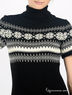 Очаровательное, эластичное жаккардовое платье с короткими рукавами и воротником гольф. Изделие украшено контрастной, узорной вязкой.