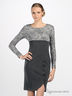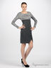 Строгое женское платье благородного серого цвета. Прямого силуэта. Лиф и юбка платья выполнены из тканей разной фактуры. Лиф отрезной из мягкого трикотажа, с завышенной линией талии. Грудь подчеркнута рельефными вытачками. Округлый неглубокий вырез горловины. Длинный прямой рукав. На спинке длинная застежка-молния. Юбка трикотажная, однотонная. Крой "с запахом". Пуговицы можно расстегнуть.