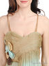 Детали: тонкие многорядные бретели; отрезной лиф дополнен простроченными складками; застегивается на молнию сзади; декоративные нашивки