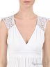 Детали: v-образный вырез горловины с запахом. Лиф присборен на втачной пояс, по боками изделия трикотажные ленты, завязывающиеся на спине, спинка декорирована кружевом