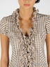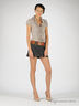 Отрезное женское платье. Верх хлопковый - застегивается спереди на пуговицы, короткие рукава фонарики, украшен рюшами. Низ джинсовый - прямого кроя, с двумя карманами и шлевками. В комплект входит широкий пояс - резинка с кожаными вставками.