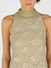 Трикотажное платье свободного силуэта. Воротник-стойка, застегивающийся на пуговицы сзади. Украшено кружевом.