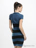 Классическое платье из плотной трикотажной ткани приталенного силуэта. Широкий ворот-хомут. Короткий рукав собран на трикотажную ленту. Втачной пояс декорирован бантом. Низ изделия декорирован комбинированными трикотажными вставками.