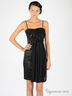 Приталенное платье из плотного атласа. Тонкие регулируемые бретельки. Застегивается на молнию сбоку. Спереди шифоновая вставка с декоративными цветами.