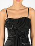 Приталенное платье из плотного атласа. Тонкие регулируемые бретельки. Застегивается на молнию сбоку. Спереди шифоновая вставка с декоративными цветами.
