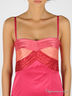 Приталенное платье из плотного атласа. Тонкие регулируемые бретельки. Лиф декорирован атласными лентами. Застегивается на молнию сзади.