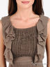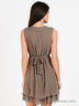 Детали: круглый вырез, без рукавов, изделие украшено рюшами, спереди плиссированная вставка, талия на поясе, сбоку застегивается на молнию