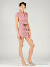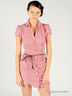 Приталенное хлопковое платье. Отложной воротник на стойке. Глубокий вырез. Застегивается спереди на пуговицы. Короткие рукава-фонарики, край рукава посажен на резинку. Присборенная юбка. В комплект входит тонкий ремешок.