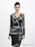 Стильное трикотажное платье с эффектом запаха. Застегивается на пуговицу на спине. V-образный вырез горловины. Талию подчеркивает эластичный пояс. Длинный прямой рукав.