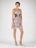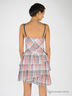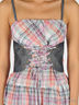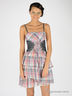 Приталенное платье из легкого хлопка. Тонкие регулируемые бретельки. Верх спинки посажен на резинку. Застегивается сбоку на молнию. Многослойная юбка. Спереди вставка из денима на шнуровке.