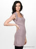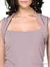 Силуэт платья прилегающий, подчеркивающий фигуру. Эластичный трикотаж средней плотности. Без рукавов. Вырез горловины "каре", дополнен воротником. Низ изделия оформлен в виде резинки.