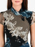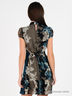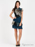 Детали: воротник-стойка, рукава-фонарики на резинке, спереди украшено многослойными воланами, талия подчеркнута поясом, сзади застегивается на пуговицы