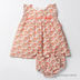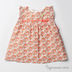 Платье свободного кроя застегивается на четыре пуговицы на спинке. Рукава-"бабочки". Полочка оформлена кружевной пришитой лентой, бантиком и пришитыми вязаными цветами. Хлопковый подклад.