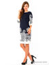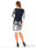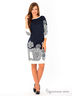 Экстравагантное платье прямого кроя - красивый вариант для создания делового, женственного образа. Изделие с рукавами 3/4, округлым вырезом горловины. Украшена модель контрастной расцветкой.