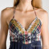 Верх модели выполнен их хлопка в клетку с богатой вышивкой спереди. Спина открытая с оригинальными брителями, внутри полосы на спине резинка. Юбка из трикотажа с отстрочкой но низу.