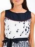 Цельнокройное приталенное платье из легкого, приятного на ощупь материала. Широкая горловина. Плотная хлопковая кокетка. Талия по бокам посажена на многорядное резинки и подчеркнута поясом. Легкая трикотажная подкладка.