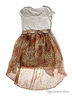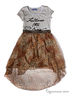 Модное платье с коротким рукавом. Верх платья выполнен из трикотажной ткани. Ассиметричная форма юбки из легкой воздушной ткани с животным принтом придает модели необычный вид. Спереди юбка украшена воланами. По линии талии у платья декор в виде молнии.