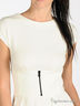 Платье приталенного кроя из плотного трикотажа. Круглый вырез. Короткий рукав присборен. На линии талии декоративный элемент в виде молнии. Юбка присборена. Застегивается сзади на молнию.