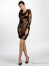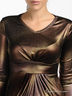 Детали: v-образный вырез горловины дополнен шелковистой лентой, длинный прямой рукав, втачной пояс, платье декорировано оригинальными складками