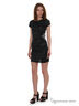 Женское облегающее платье из эластичного материала черного цвета. Изделие декорировано драпировкой по линии талии и цветком, который расшит пайетками и стразами.