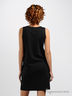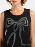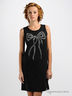 Комфортное и стильное трикотажное платье прямого покроя. Круглая горловина. Без рукавов. Два больших прорезных кармана. Полочка декорирована крупным стразами в виде элегантного банта.