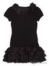 Нарядное платье выполнено из нежного вискозного трикотажа. Округлый вырез горловины декорирован атласными цветами со стразами, короткий прямой рукав, низ изделия декорирован атласными многоярусными оборками.