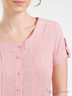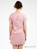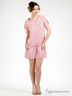 Платье прямого кроя из легкого хлопка. Широкая круглая горловина. Короткие рукава. Застежка на пуговицах до пояса. Заниженная талия на завязках. Два передних кармана. Отрезная юбка. На манжетах, полочке и спинке декоративные складки. Подкладка рукавов, пояс, пуговицы и низ изделия выполнены из хлопковой ткани в более крупную полоску. Подкладка юбки ярко-красная.