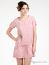 Платье прямого кроя из легкого хлопка. Широкая круглая горловина. Короткие рукава. Застежка на пуговицах до пояса. Заниженная талия на завязках. Два передних кармана. Отрезная юбка. На манжетах, полочке и спинке декоративные складки. Подкладка рукавов, пояс, пуговицы и низ изделия выполнены из хлопковой ткани в более крупную полоску. Подкладка юбки ярко-красная.