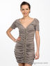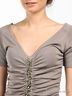 Детали: глубокий V-образный вырез, V-образный вырез на спинке, короткие рукава-реглан, присборенно по боковому шву, полочка декорирована планкой сос стразами и бусинами
