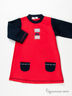 Модное детское платье расклешенного силуэта из хлопкового трикотажа. Ворот-стойка. Длинные прямые рукава. На полочке стильные нашивки и бантик. Платье дополнено двумя накладными карманами.