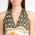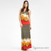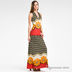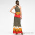 Длинное трикотажное платье прямого кроя. V-образный вырез с нахлестом, отрезной лиф. Лиф переходит в бретельки, сшитые на спине и соединенные с задней частью лифа. Платье оформлено ярким принтом.