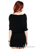 Детали: широкий воротник хомут, талия на завязках, спереди два накладных кармана, короткие цельнокроеные рукава. Низ изделия оформлен в рубчик