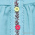 Платье свободного кроя застегивается на пуговицы на спинке. Полочка украшена имитацией планки-застежки с пуговицами, вышивкой и тканевыми листочками. Вырез горловины, манжеты и подол декорированы пришитой тесьмой.