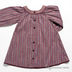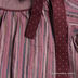 Платье свободного кроя застегивается на пуговицы на спинке по всей длине изделия. Широкие рукава посадены на манжеты на пуговице. В ворот вставлена руглирующая лента, завязывающаяся в бант.