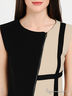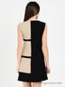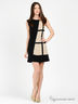 Великолепное платье из плотного, неэластичного, приятного на ощупь материала. Приталенный силуэт изделия. Округлый вырез горловины. Застежка спереди на молнию. Изделие декорировано вставкой бежевого цвета и широкими горизонтальными и вертикальными полосами.
