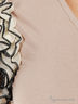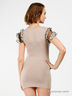 Оригинальное короткое платье приталенного силуэта. Округлый вырез горловины. Короткие сетчатые рукава с рюшами. Спереди модель украшена цветком-брошью.