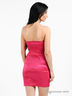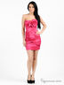 Яркое модное платье-бандо приталенного силуэта из плотной, переливающейся ткани. В верхний край вшиты маленькие прозрачные петли для лямок. Застежка на потайную молнию в боковом шве. Платье декорировано оригинальным цветком из волана и эффектными крупными вертикальными оборками. Спинка собрана на резинку.