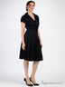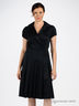 Простое платье из хлопчатобумажной ткани. Отрезной лиф с запахом. Глубина декольте фиксирована. Отложной воротник с лацканами. Короткий рукав с декоративным складками. Юбка-клеш с простроченным складками. Застежка - потайная молния, проходит по правому боковому шву.
