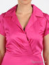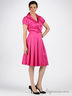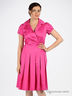Простое платье из хлопчатобумажной ткани. Отрезной лиф с запахом. Глубина декольте фиксирована. Отложной воротник с лацканами. Короткий рукав с декоративным складками. Юбка-клеш с простроченным складками. Застежка - потайная молния, проходит по правому боковому шву.