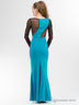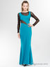 Силуэт - русалка. От линии колена платье слегка расклешается. Длинный рукав, верхняя часть линии груди, декоративный вырез - щель под грудью, часть спины оформлены изящной чёрной сеткой. Высокий вырез - лодочка.