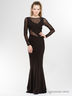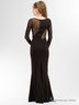 Силуэт - русалка. От линии колена платье слегка расклешается. Длинный рукав, верхняя часть линии груди, декоративный вырез - щель под грудью, часть спины оформлены изящной чёрной сеткой. Высокий вырез - лодочка.