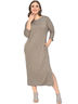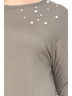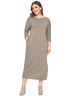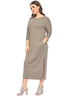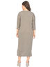 Ультрамодное платье свободного силуэта из шелковистой вискозы, декорированное разноразмерными жемчужными бусинами, с разрезом, боковыми карманами в швах.